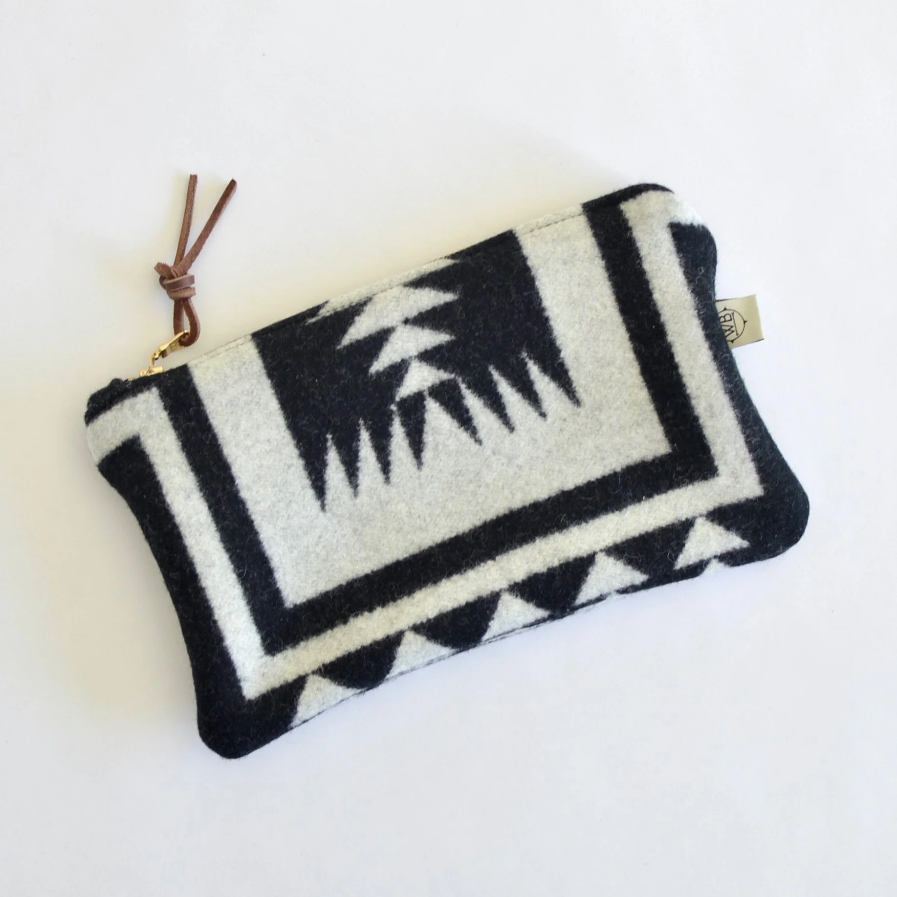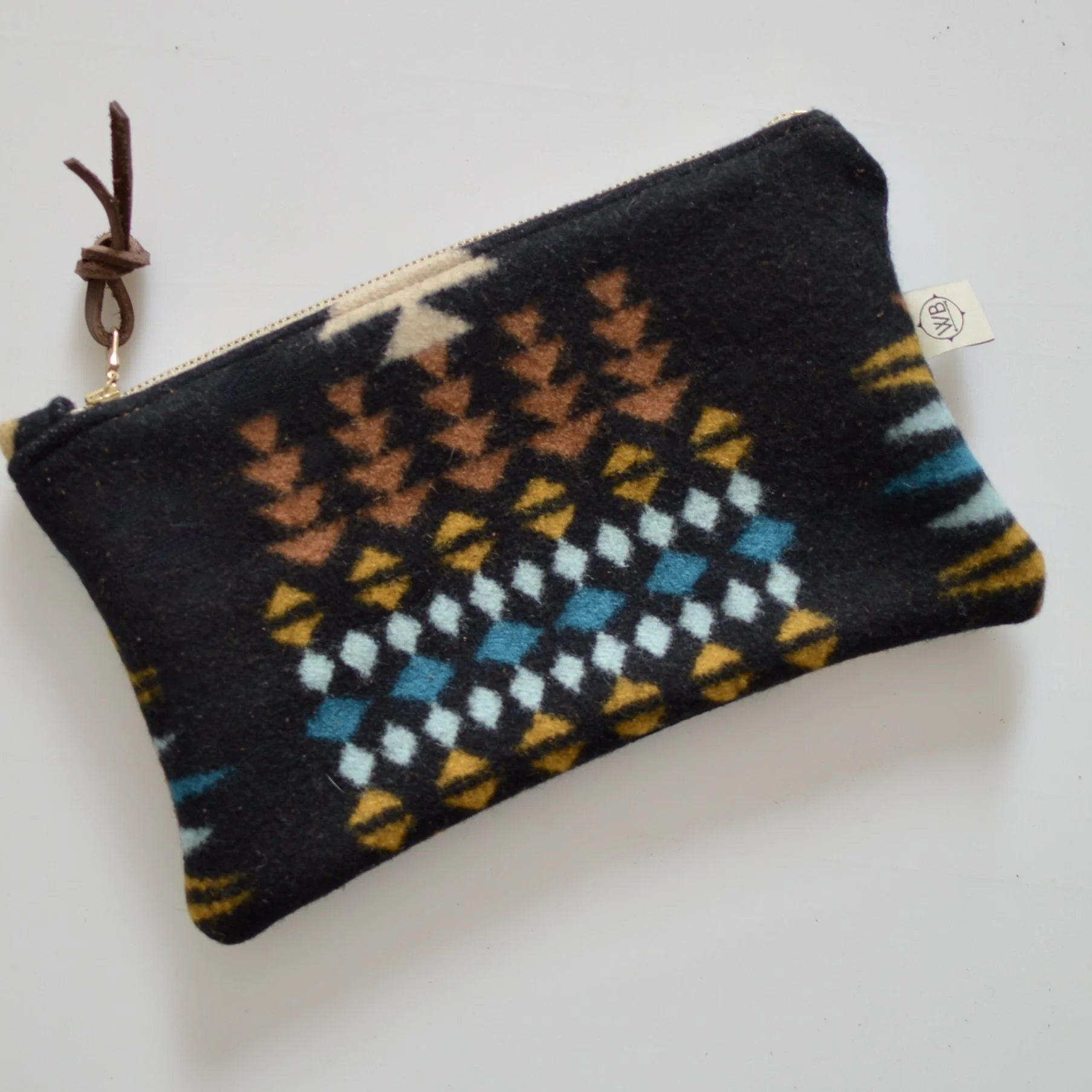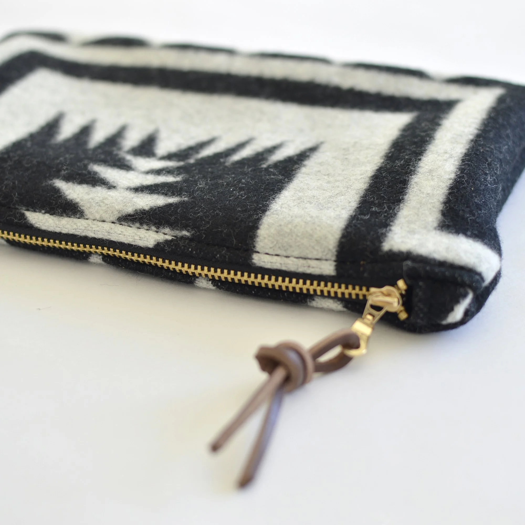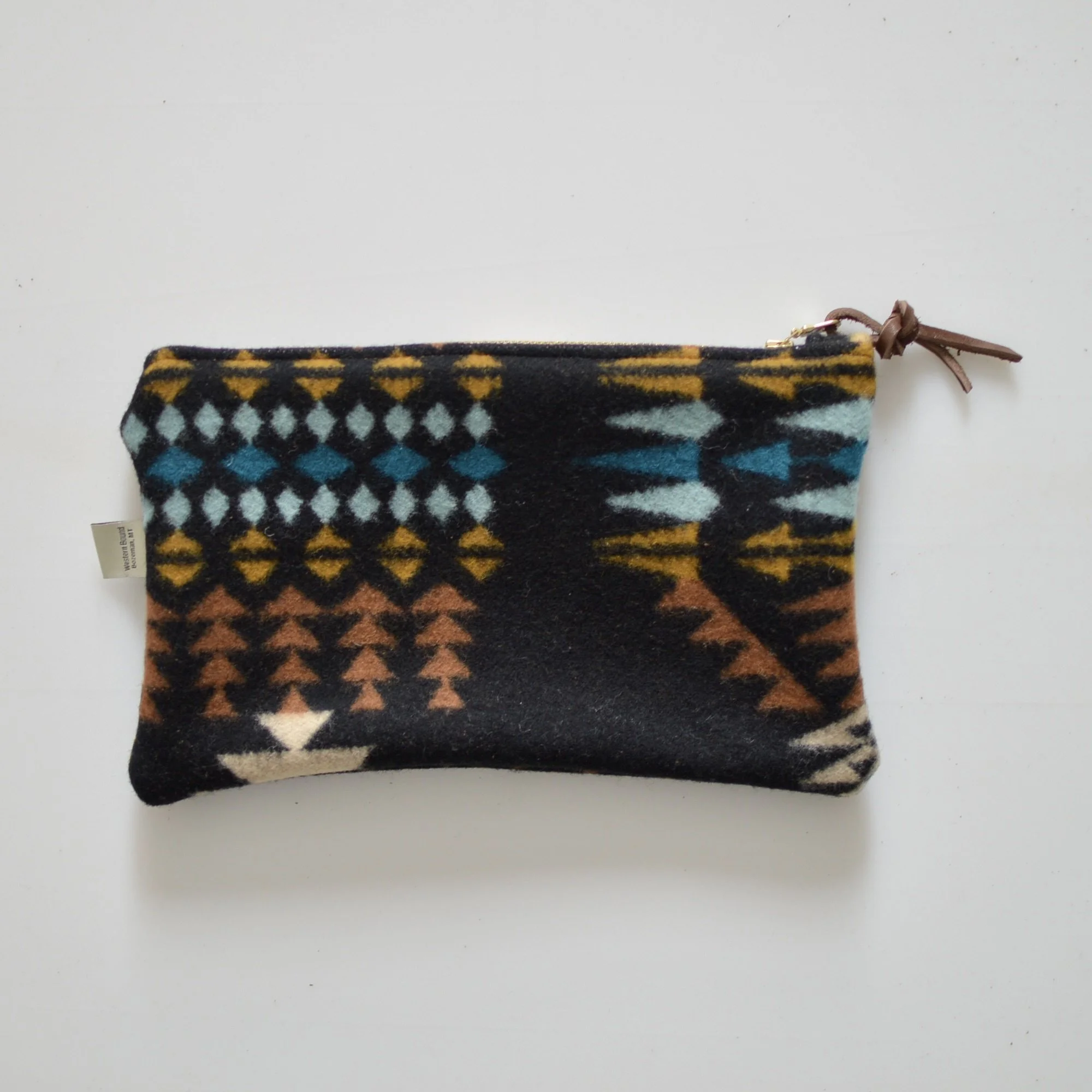 Made with a YKK zipper and includes a leather zipper pull.