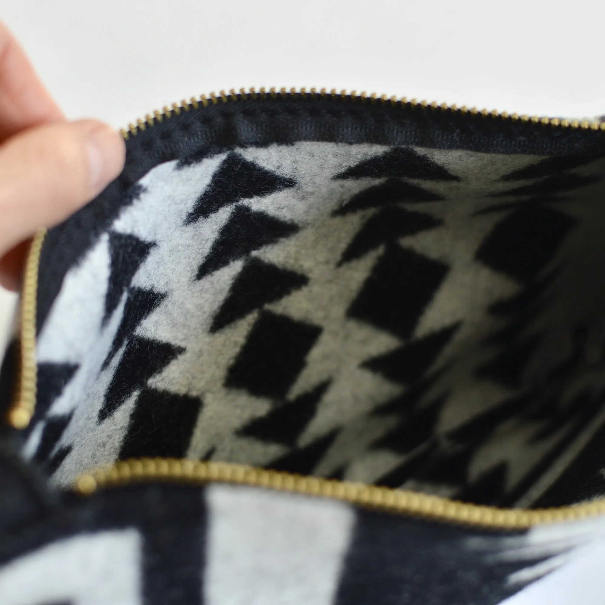 Outside is made with Pendleton® Walking Rock Fabric. Inside is unlined and shows the other side of the Pendleton® fabric. Front and back pattern are the same.