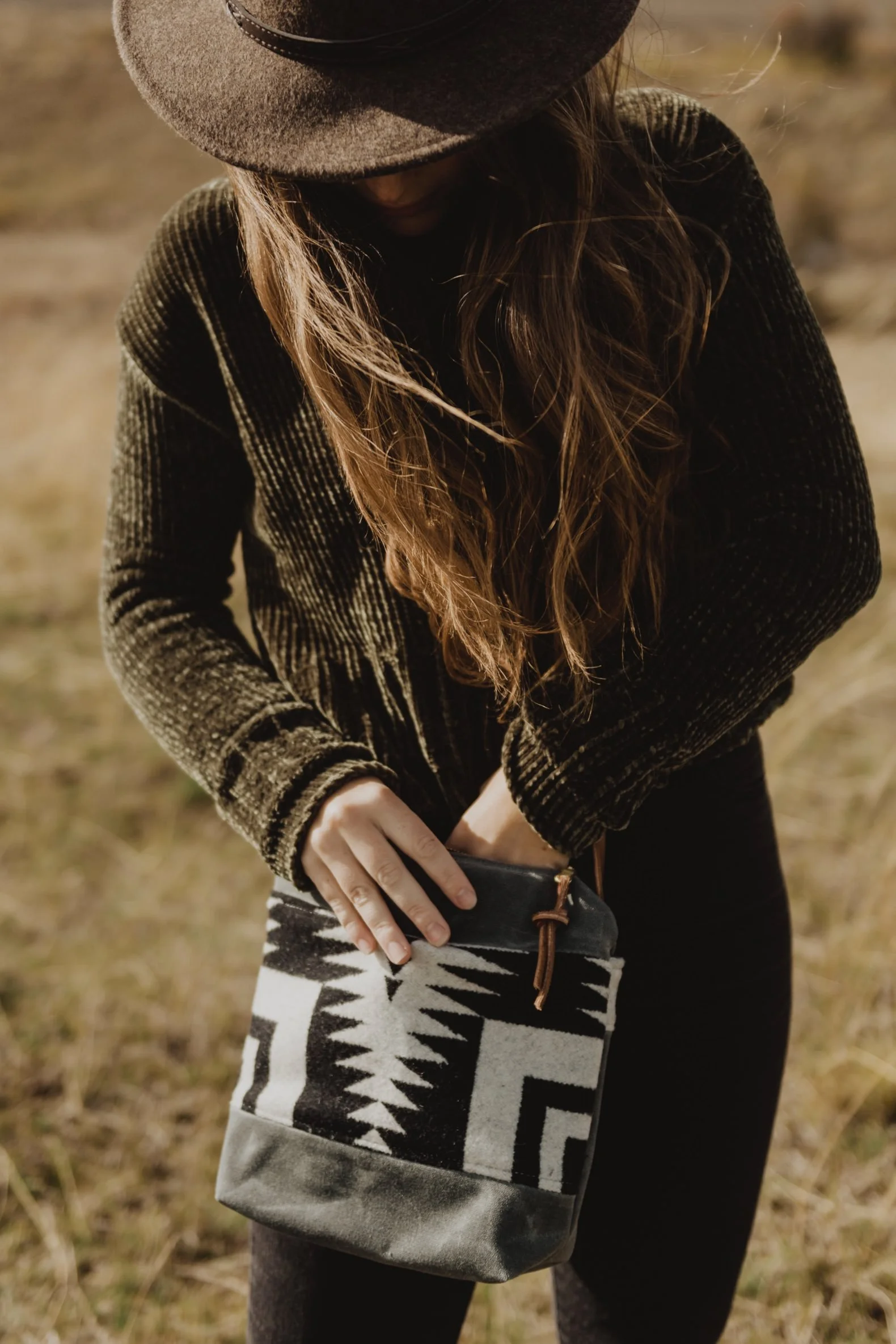 A stylish and functional waxed canvas and wool bag. Ideal for everyday use, it features a convenient back pocket for quick access to your phone or keys. Inside, you'll find an open pocket to organize your essentials, while the zipper top ensures everything stays secure.