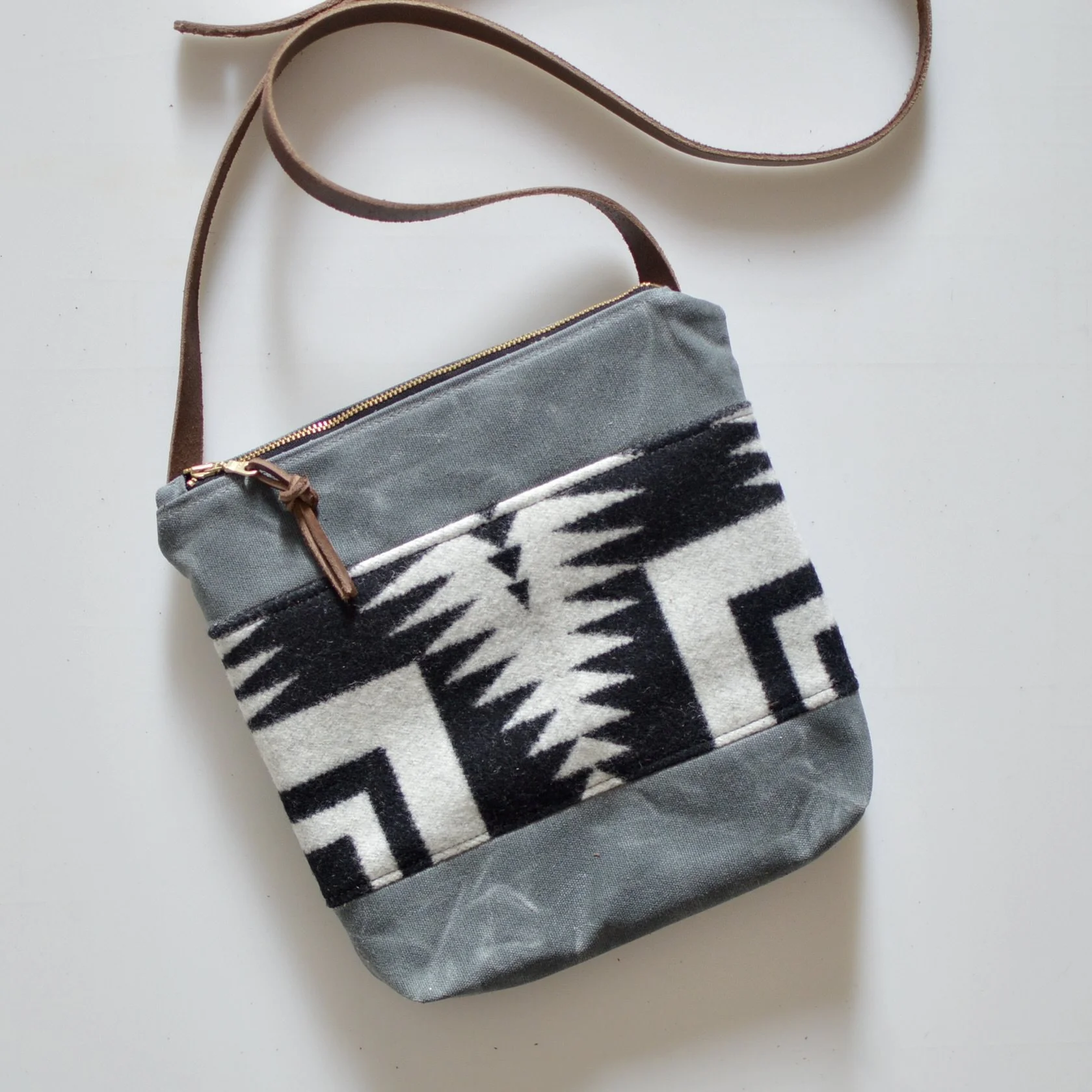 Exterior is made with grey waxed canvas and Pendleton® wool fabric. Interior is a charcoal brushed cotton.